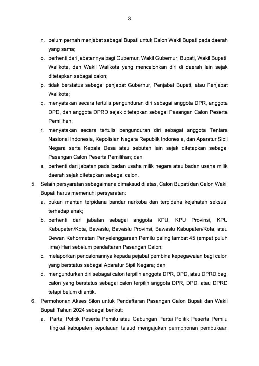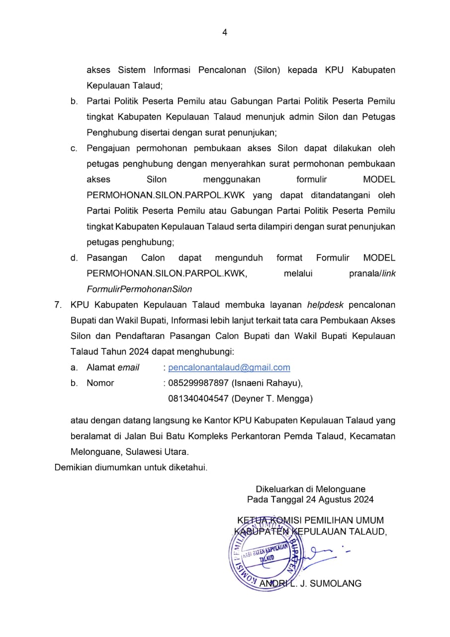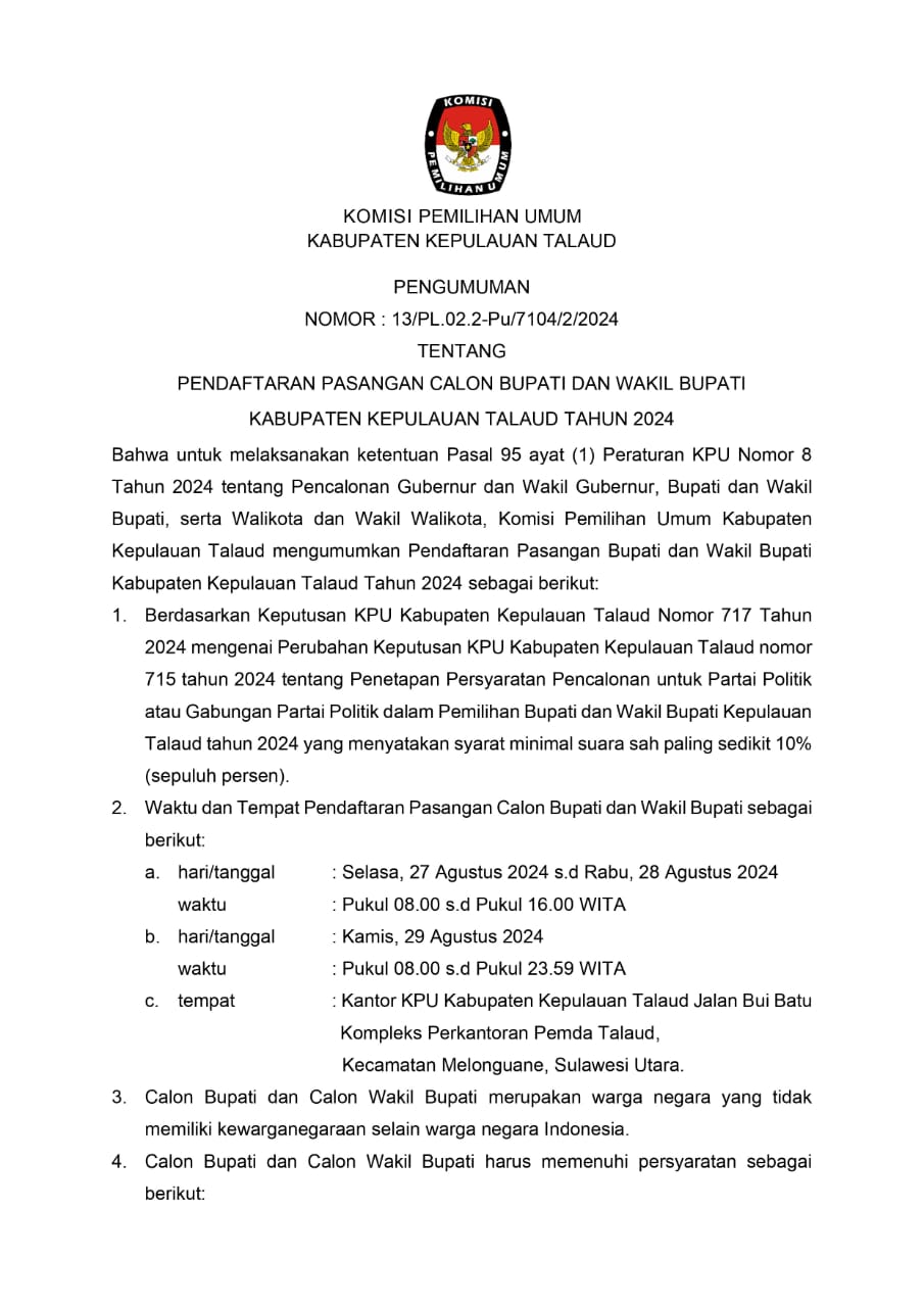 PENGUMUMAN KPU TALAUD (PENDAFTARAN PASLON BUPATI DAN WAKIL BUPATI TAHUN 2024)